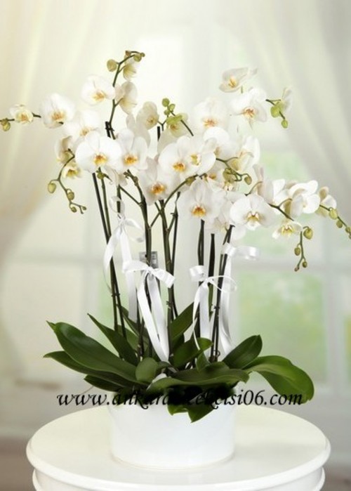 Yuvarlak Beyaz Seramik Saksıda 8 Dal Beyaz Orkide,İhtişamlı duruşu ile sevdiklerinize hoş bir süpriz yapın!