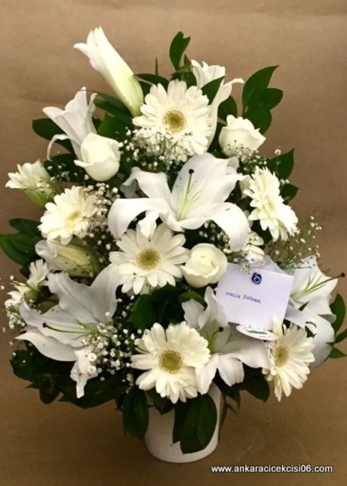 Beyaz Seramik Saksı İçersinde Beyaz Lilyum,Gül,Gelbera ile Hazırlanmıştır.