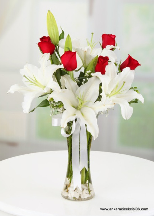 Cam Vazoda 2 Dal Lilyum ve 5 Adet Kırmızı Gül Tasarımı ile Sevdiklerinize Güzel Bir Süpriz Yapabilirsiniz.