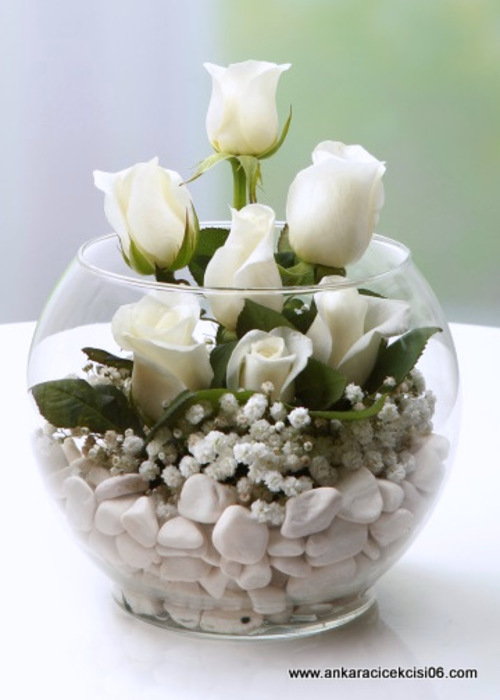 Akvaryum cam vazoda 7 Adet beyaz gül tasarımı