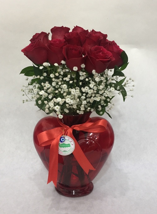 Kırmızı kalp vazoda 11 adet kırmızı gül