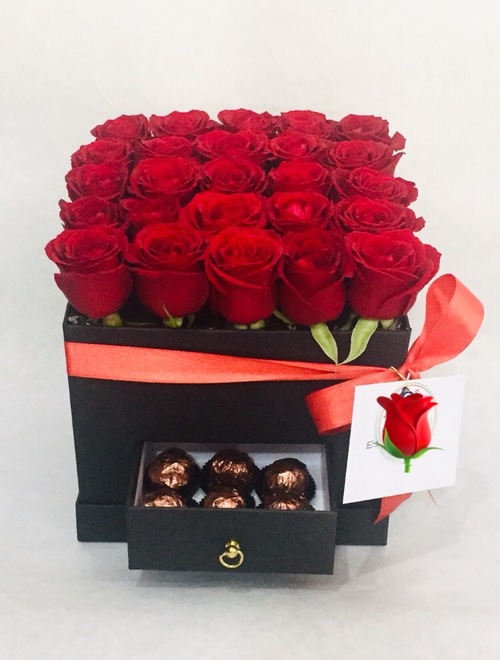 siyah çekmeceli kutuda 25 adet kırmızı gül ve 6 adet çikolata