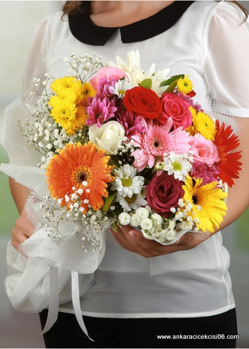 Karışık renkli mevsim çiçeklerinden hazırlanmış şık bir buket tasarımı.